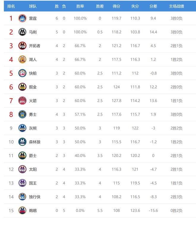 NBA最新积分榜:雷刺不败,湖人第4,火箭第7,勇士连败下滑第8